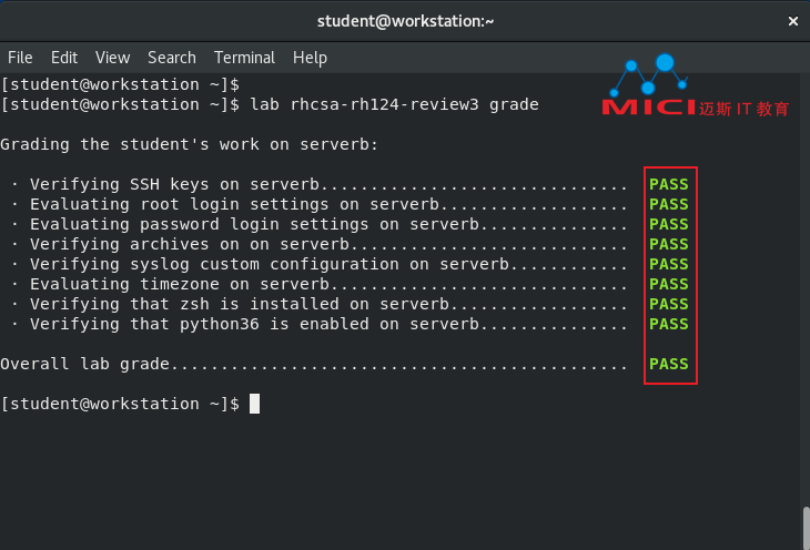 在workstation上,运行lab rhcsa-rh124-review3 grade命令以确认本练习是否成功。
