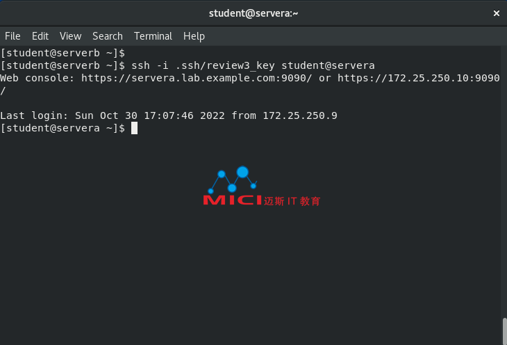 2.2 使用ssh命令,确认您可以从serverb以student身份并使用SSH私钥/home/student/.ssh/review3_key登录servera,而目不会提示您输入密码。